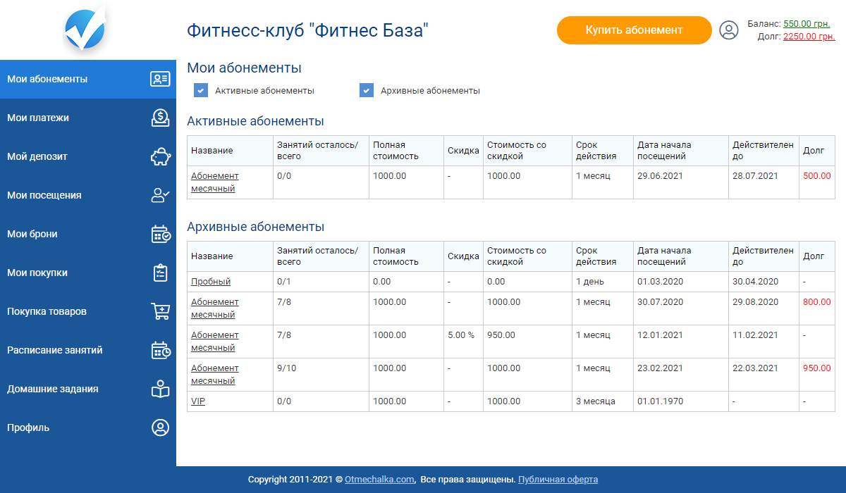 - перегляд усіх своїх абонементів, розкладу занять з тренерами та записів — без зайвих дзвінків адміністратору;