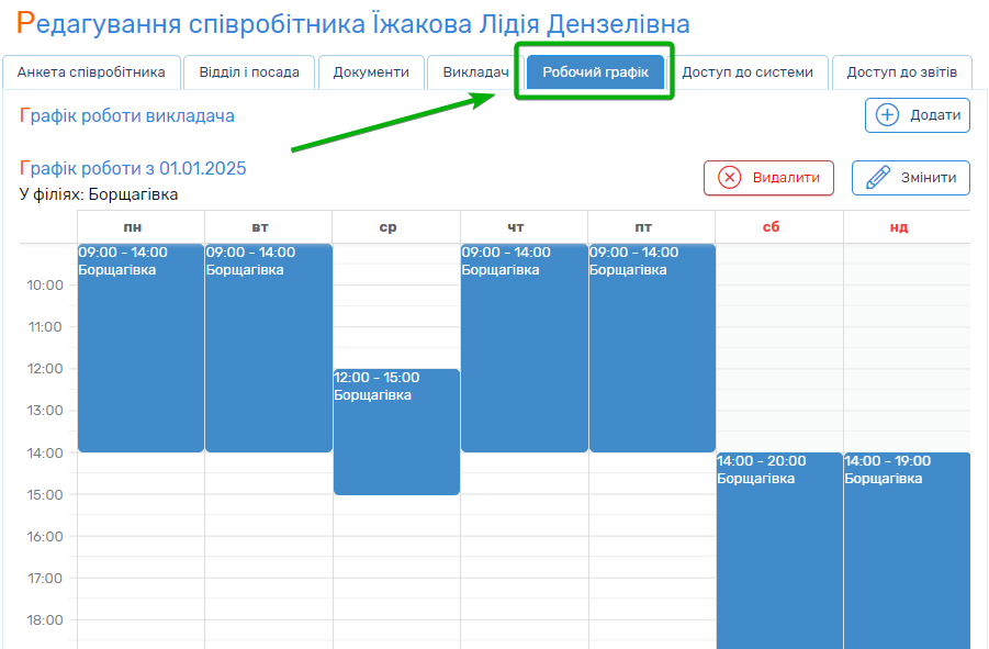 1. Привязка рабочего времени сотрудников: добавьте график в меню Сотрудники - в профиле сотрудника. Чтоб рабочий график появился в Расписании выберите вид расписания "По преподавателях".