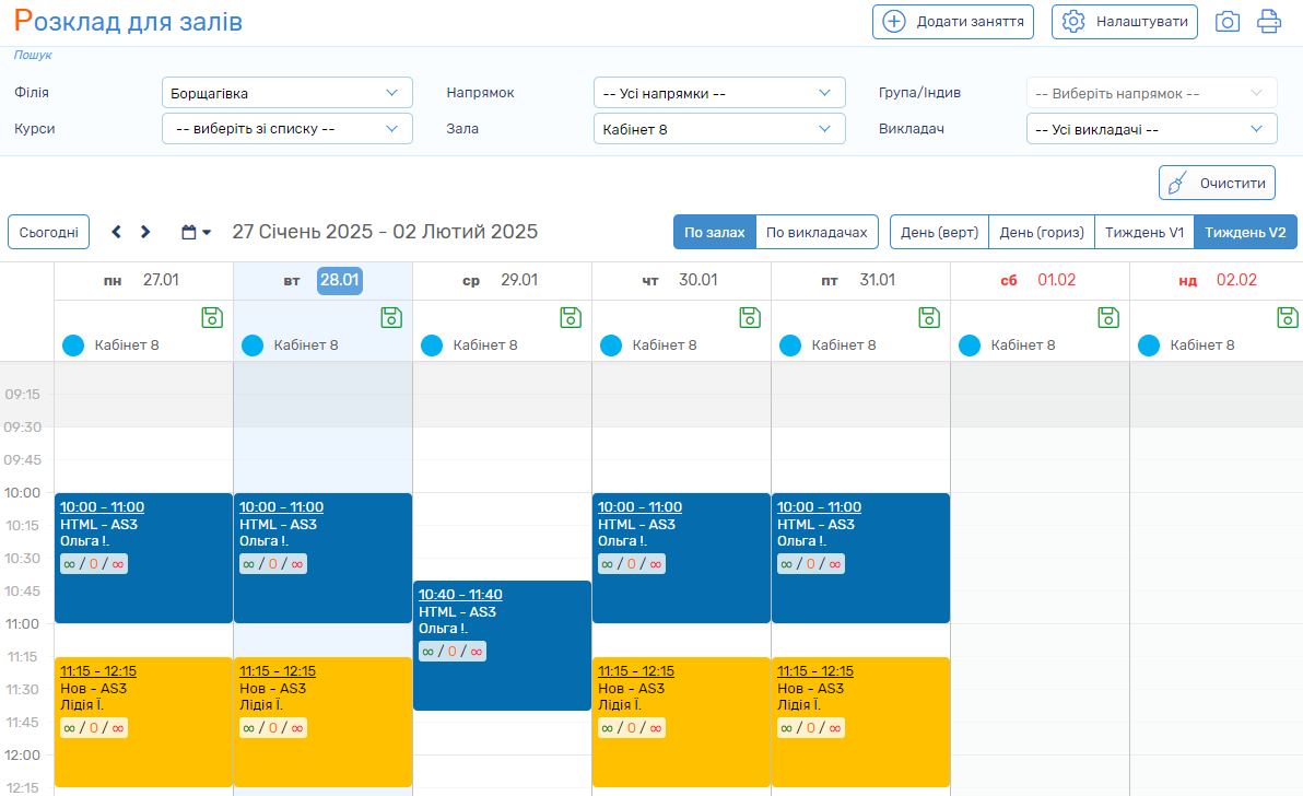 - По залам: Расписание будет отображаться по тому же принципу, что и раньше, с привязкой к помещению, в котором происходит каждое занятие. Пользователи смогут увидеть, какие занятия проводятся в каждом зале на конкретный день или время.